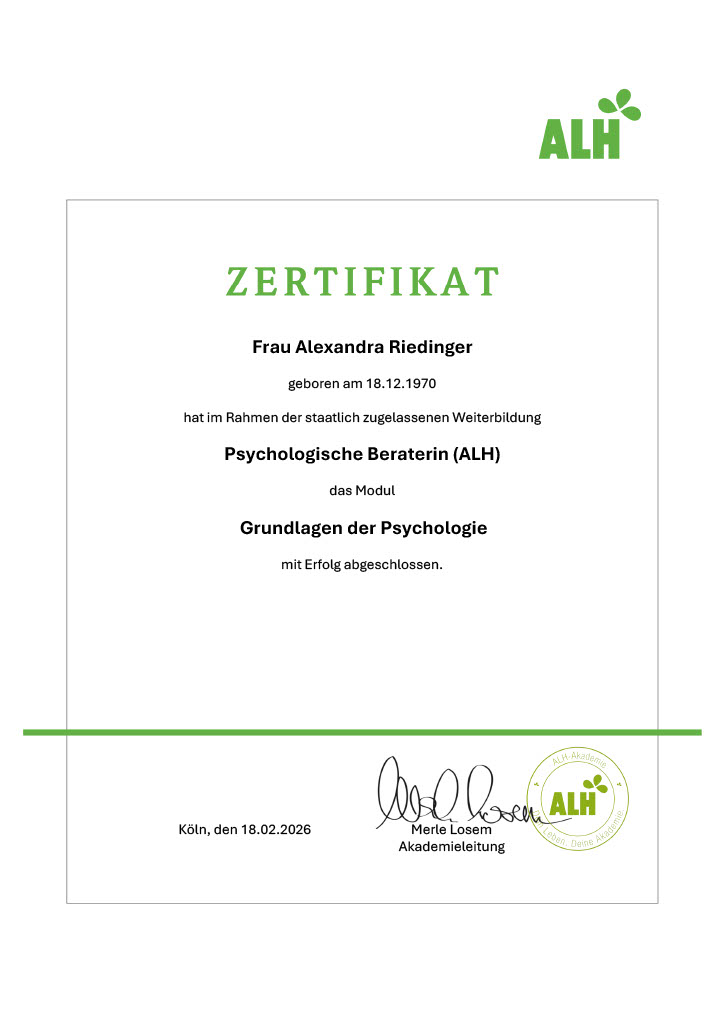 Seit 2025 in Ausbildung zur Psychologischen Beraterin (ALH Akademie).